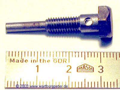 Wer Zugang zu einer Drehbank hat, kann sich eine Schraube nach diesem entsprechenden Muster anfertigen. Diese Schraube erfüllt zwei Anforderungen: Sie fixiert die Ölleitung am Vergaser und transportiert in ihrem inneren das Öl bis in den Ansaugtrichter des Vergasers. |