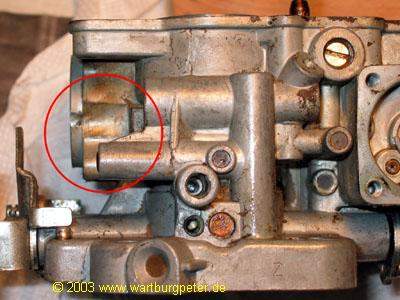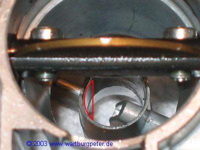 Um die Öldüse richtig plazieren zu können, muß ein Stück von der Wandung des Zerstäubertrichters abgetragen werden (rote Markierung). Links sieht man die veränderte Form, unten die "originale" Form. |