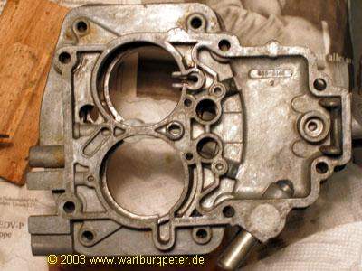 Hier sieht man die geöffnete Pumpe. Viel zu erkennen ist nicht und weiter zerlegen wollte ich das filigrane Bauteil nicht. Man kann die Nockenwelle erkennen, die vom Gaspedal aus den Mengendurchfluß des Öls reguliert, indem sie eine unter Federkraft stehende Buchse im inneren verschiebt. Links außen (im Bild) wird der Seilzug befestigt, rechts sieht man den Pumpenantrieb. |