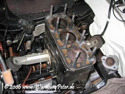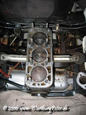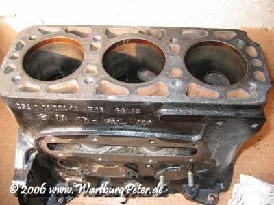 Dies ist der 1. Motor meines Wartburg Camping. Vom Vorbesitzer weiß ich, daß der Motor noch "erster Schliff" ab Werk ist, nur nach 50.000 km mußte die Kurbelwelle wegen Lagerschadens gewechselt werden. Heute hat der Motor, der übrigens im Dezember 1966 gebaut wurde, etwa 150.000 km auf dem Tacho und klingt schon etwas klapprig, fährt aber ansonsten ohne Probleme. Da ich das Auto jedoch als solches auf jeden Fall zuverlässig benötige und auch der Freilauf so seine Macken hat, habe ich mich also entschlossen, den Motor aufzuarbeiten. Da alles an dem Auto so schön im Original vorliegt, kam für mich hier nur eine Reparatur in Fragen, bei der möglichst die Originalteile wieder zum Einsatz kommen. D.h., die Kolben müssen nun zwar neuen weichen, da ein nächster Schliff dies nun einmal erfordert, aber die Kurbelwelle und alles übrige wird wiederverwendet.