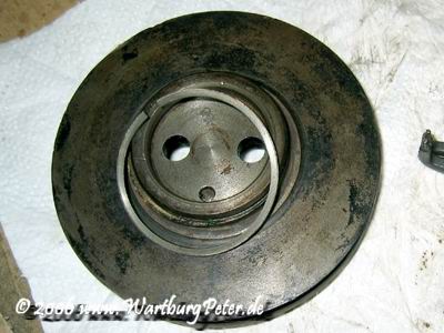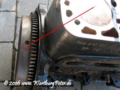 Bevor man die Schwungscheibe demontiert, sollte man auf dieser nach einer Null-Markierung suchen. Die sollte sich im oberen Bereich finden, d.h., wenn Kolben 1 sich im OT befindet. Jedoch tragen nicht alle Schwungscheiben eine Markierung und so empfehle ich, selbst eine anzubringen. Bei alten Motoren wurde Schwungscheibe zusammen mit dem Kurbeltrieb ausgewuchtet (Null-Marke), so daß bei jedem Wechsel ein erneutes Auswuchten erforderlich wurde. In späteren Jahren wurden Kurbelwellen und Schwungscheiben getrennt voneinander ausgewuchtet, so daß man die Schwungscheibe in jeder Lager an der Kurbelwelle anschrauben kann.