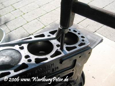 Um die Stehbolzen zu entfernen, kontert man 2 Muttern. Sollte ein Stehbolzen sich nicht freiwillig lösen, kann man ihm während man am Ringschlüssel zieht, mit dem Hammer einen kleinen Klapps geben, aber niemals auf das Gewinde schlagen!