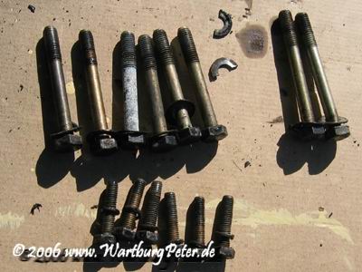 Der Motorblock wird zerlegt; die Schrauben haben unterschiedliche Längen, man sollte sich also merken, wo welche hinein kommt. Der Druck auf die Federscheiben ist enorm, eine zerfiel bei der Demontage. Die Spezialschrauben am Motor haben eine bestimmte Güte. Wer zwischenzeitlich die Schrauben galvanisieren läßt, sollte bewußt darauf achten, ob er die richtigen Schrauben wieder verwendet!
