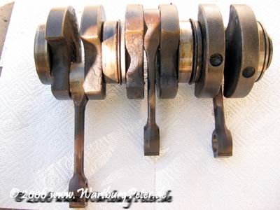 Nach 150.000 km sehen die Kolben geradezu perfekt aus, alle Kolbenringe sind sauber und frei beweglich, ebenso ist eine makellose Kolbenoberfläche festzustellen, mit wenig Ölkohle. Dennoch hatten die Kolben im OT schon einiges an Spiel und klapperten. Auch die Kurbelwelle (45PS) sieht passabel aus, jedoch kippelten die Hauptlager schon heftig nach allen Seiten! Zeit für eine Reparatur! |