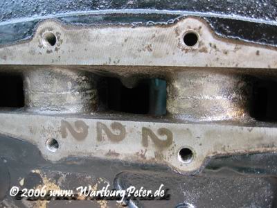 Der gereinigte Motorblock kann nun in die Werkstatt. Die Ziffern auf der Dichtfläche der Vergaserseite besagen, daß eine Abweichung der Angaben zu den Kolbenmaßen bestehen. Hier im Beispiel hat jeder Zylinder 2 Zehntel übermaß. Diese Angabe ist nun unwichtig geworden, da mit dem neuen Schliff neue Maße gelten. |