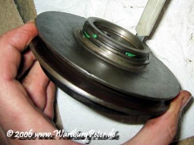 Die Keilriemenscheibe mit der Kolbenringabdichtung läßt sich mit Hilfe eines Cuttermessers gut zerlegen, reinigen und zusammenbauen. Das grüne Zeugs da im Bild ist ein spezielles Fett.