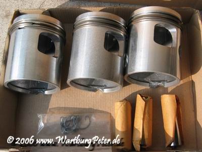 Man kann sich Kolben selbst beschaffen oder diese Aufgabe der Motorenschleiferei überlassen. Jedoch sollte man sich im klaren sein, daß man vielleicht ein Schleifmaß überspringen muß, weil eine bestimmte Kolbengröße nicht mehr aufzutreiben ist. Ich hatte Glück und konnte meinem Motor das erste Schleifmaß spendieren. Die Kolben wurden noch einmal von der Zylinderschleiferei (Fa. Kühnapfel - meine Empfehlung) ausgemessen, um festzustellen, ob die eingeschlagene Größe tatsächlich stimmt. Siehe da, 2 Kolben hatten statt der angegebenen 73,69 mm nur 73,68 mm Durchmesser. Wichtig ist, das man dann nichts mehr vertauscht. So könnte ich auf meinen Motor an der Vergaserseite -1 0 -1 ranschreiben, da die Zylinder passend zum Kolben geschliffen und gehont sind.