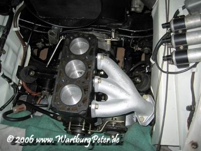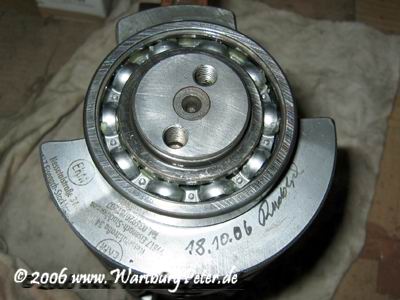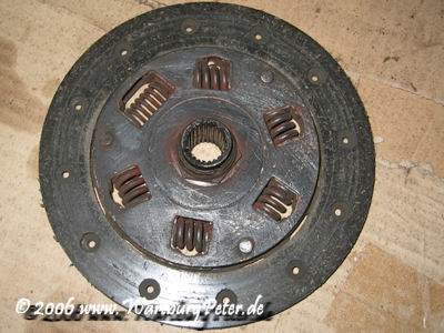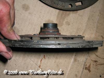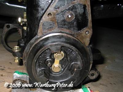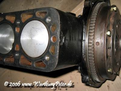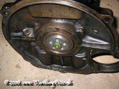 Bevor die Schwungscheibe montiert werden kann, ist das nicht übertrieben gefettete Nadellager für die Getriebeabtriebswelle einzusetzen. Die Schwungscheibe muß wieder in die markierte Richtung (Kolben 1 im OT) gebracht werden, bevor sie verschraubt und gesichert wird. Im weiteren sind dann die Kupplung zu montieren. Ein Zentrierdorn ist hier nicht zwingend erforderlich. Man kann sich auf seinen Tastsinn und Auge verlassen. Ab jetzt kann der Motor direkt im Wartburg plaziert weiter vervollständigt werden. Ebenso kann er vollständig außerhalb des Autos komplettiert werden. Die ersten Kurbelwellenumdrehungen per Hand gehen noch etwas schwer (nicht ohne zu ölen drehen --> Zweitaktöl). Doch dann läuft alles bald recht leicht. |