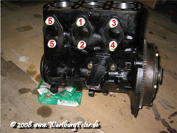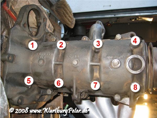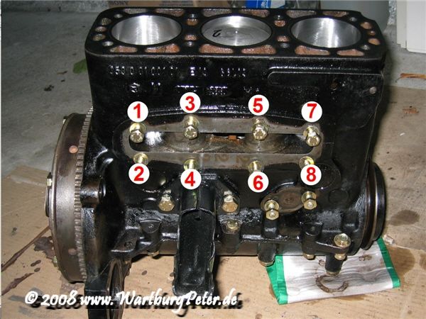5. Bei kaltem Motor werden die Muttern nun mit starrem Schlüssel in vorgeschriebener Reihenfolge um einen Winkel von 30° - 35° nachgezogen.