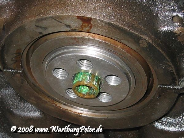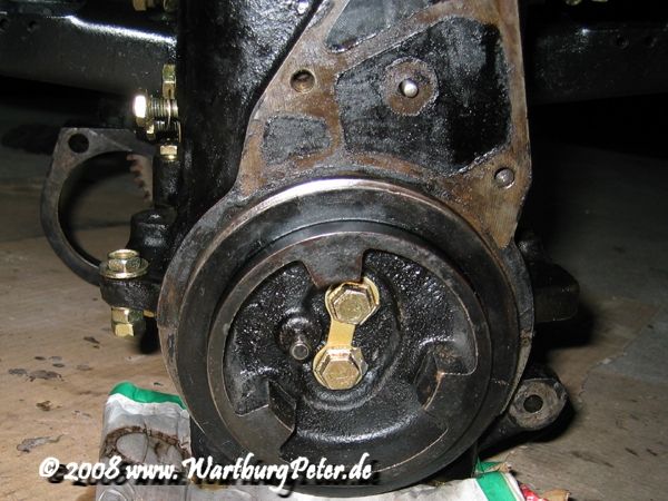 4. Keilriemenscheibe vorsichtig aufsetzen, daß geht auch ohne Spezialzange für die Kolbenringe. Durch die unsymmetrische Bohrung beider Schrauben kann die Keilriemenscheibe nur in einer Richtung montiert werden.
