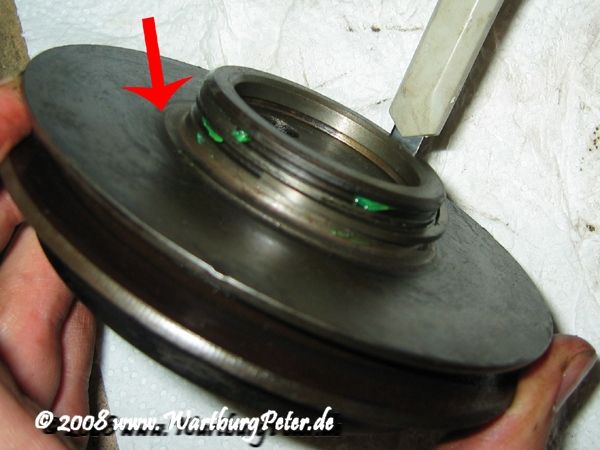 Achtung, die Keilriemenscheibe ist zur Dämpfung von Schwingungen aus zwei Teilen mittels Gummi zusammengesintert (siehe Pfeil), ähnlich einem Silentgummi. Diese Teile sind inzwischen mehr als 20 Jahre alt und können auseinander fallen (auch während des Einsatzes). Daher kontrollieren Sie bitte diese Teile!