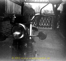 Kaum zu erkennen, ein von meiner Schwester handgemalter Tigerkopf zierte den Seitendeckel. Der Kotflügel vorn war etwas verkürzt. Mein "Moped" hatte noch den kugelförmigen Scheinwerfer, später wurden nur noch die flachen verbaut, die ich doof fand. |
