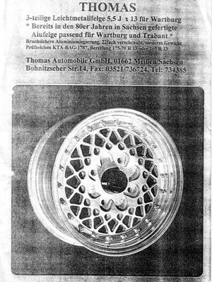 Da ist auch das Bilstein FW und die Magnesiumfelgen eingetragen, sowie noch die Irmscher Felgen, welche ich mit 185/ 65'er Reifen fuhr, damit der Motor nicht dauerhaft über 5.200 drehte. Denn die Wartburg Kurbelwellen sind (trotz geschlitzten Pleulen) Drehzahl empfindlich. Ein W1.3 mit 58 PS (die Motoren streuten aber nach oben, ca. 65PS) schaffte gestoppte 151 km/h. Mein 70PS Motor kam auch so auf 150km/h mit 5 Gang.