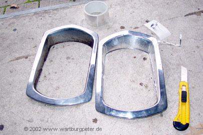 | Also habe ich die gammeligen Teile mühsam entrostet, mit Fertan behandelt und über die beschädigten Stellen Alu-Klebeband geklebt. Man sieht das nur, wenn man bewußt darauf achtet und aus 2 m Entfernung sieht alles bestens aus! Jedenfalls wollte ich die gut erhaltenen Teile nicht riskieren... Im Bild liegen behandelter und unbehandelter Lampenring nebeneinander. Die Ecken haben z.T. keinerlei Chrom mehr gehabt. Die Werkstätten in dieser Gegend verlangen z.B. für die Neuverchromung eines Frontgrills incl. aller erforderlichen Arbeiten mehr als 1.000 DM!! |