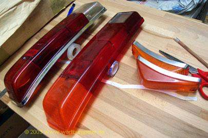 Mit einem weichen Tuch reibt man den "Chromrand" blank. Das linke Rücklicht ist ein Originalteil (unbenutzt), alle anderen sind Nachahmungen. Mal ehrlich, kann man gelten lassen, nicht? |