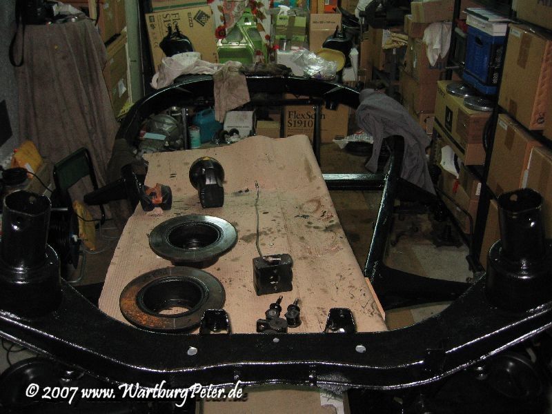 Ich habe zwar keinen Strom in der Garage, aber einen Verbandkasten. Immerhin kann ich noch bis tief in die Nacht arbeiten. Meist fange ich nach der Arbeit so gegen 19 Uhr an und werkele so 3 Stunden täglich am Fahrwerk. Nur am Wochenende, da bin ich ab Mittags zu Gange.