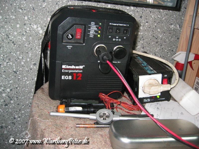 In den späten Stunden behelfe ich mir mit Akku und Transverter zu etwas Licht (36W Leuchtstofflampe). Immerhin eine satte Stunde hält der Vorrat, den ich dann über Nacht wieder nachlade.