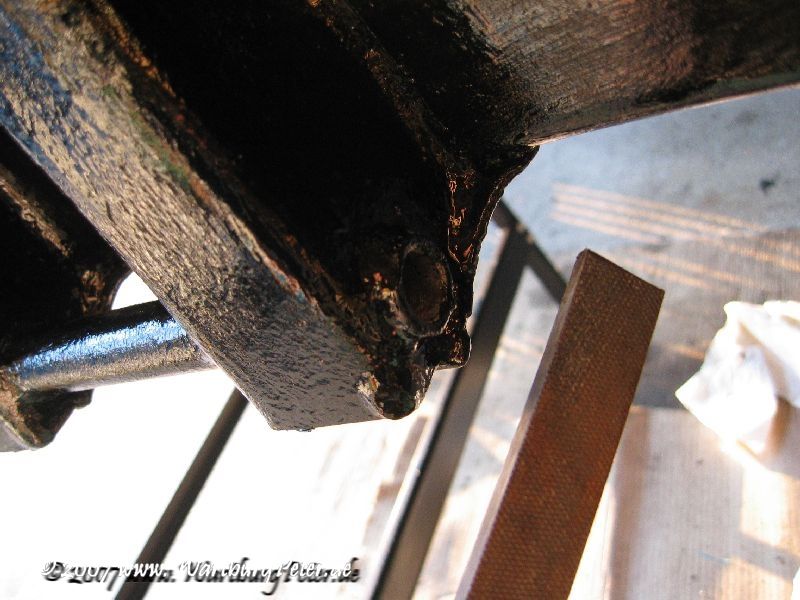 Überstehende Farbe und Zink sind von den Hülsen am Rahmen mit einer Feile sorgfältig abzutragen und zu planen. Das ist erforderlich, um einen gleichmäßigen Klemmsitz zu ermöglichen.