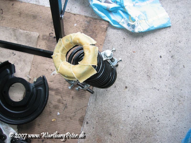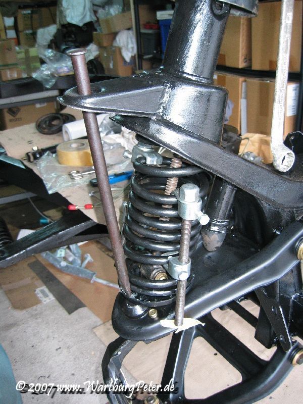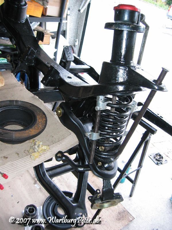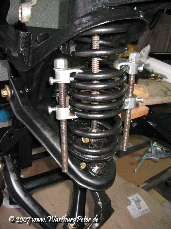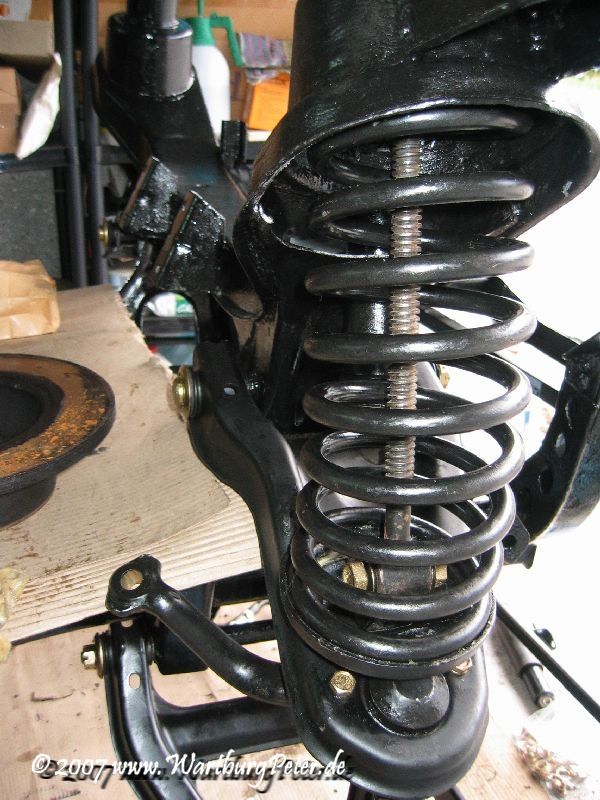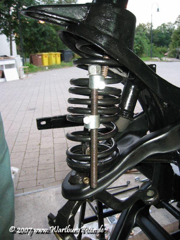Das sollte man nicht unterschätzen! Das Einsetzen der Vorderfedern ist eine zeitraubende Arbeit. Man muß auch sehr vorsichtig sein, gespannte Federn sind immer eine potentielle Gefahr! Erst nach dem die Stoßdämpfer verschraubt sind, fühle ich mich wohl.