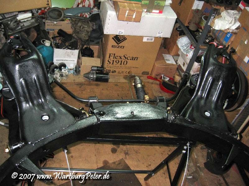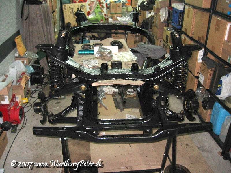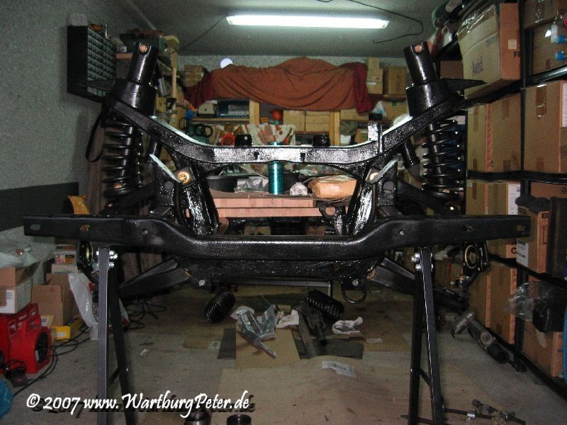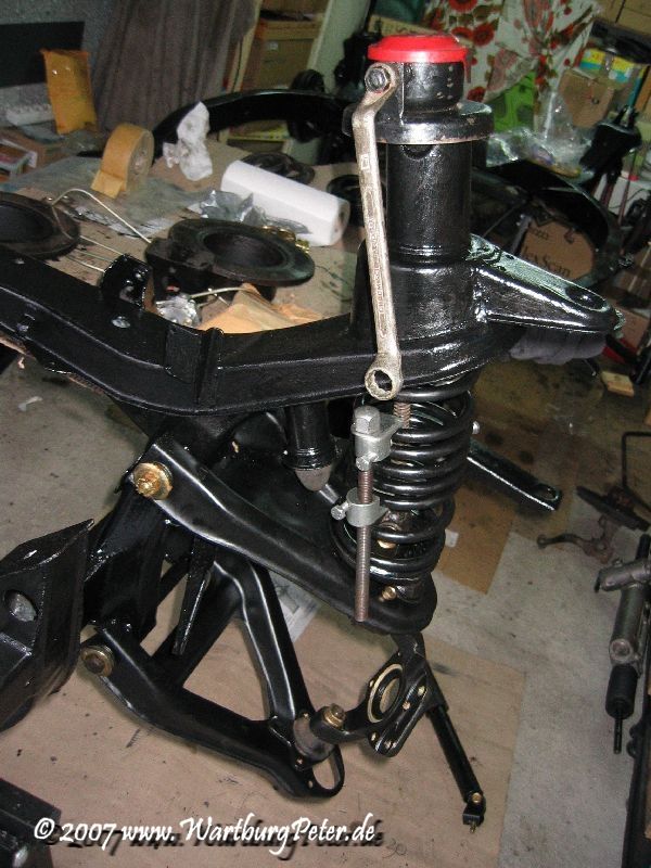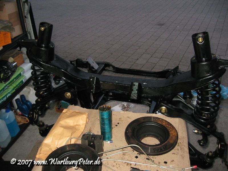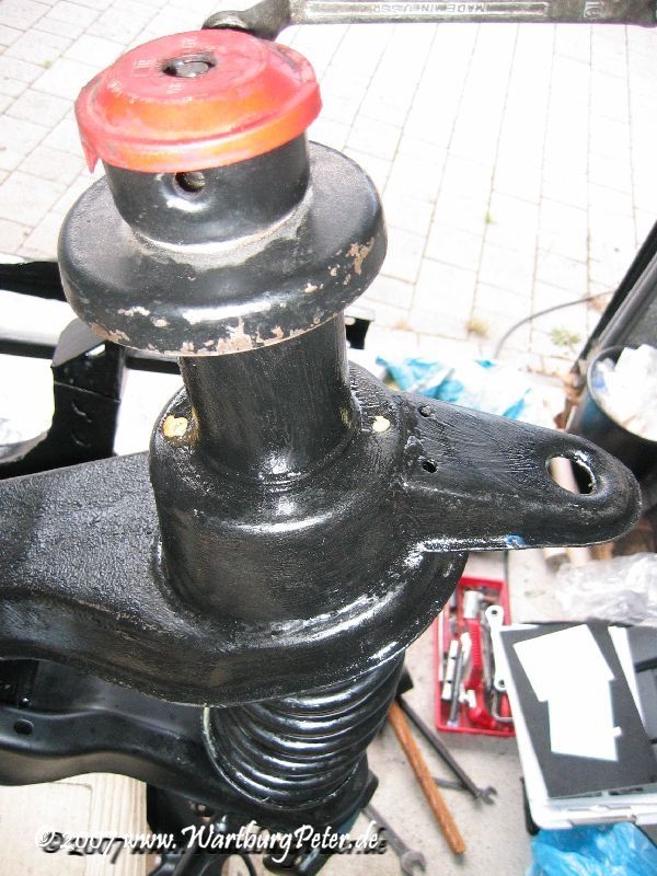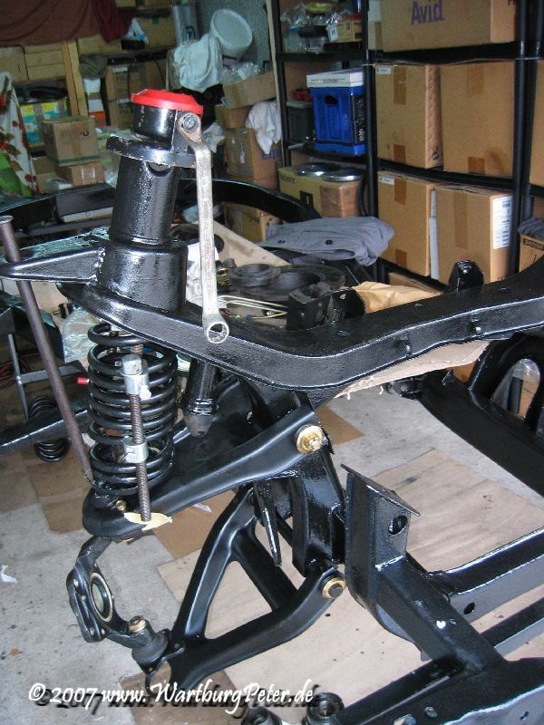 Das sollte man nicht unterschätzen! Das Einsetzen der Vorderfedern ist eine zeitraubende Arbeit. Man muß auch sehr vorsichtig sein, gespannte Federn sind immer eine potentielle Gefahr! Erst nach dem die Stoßdämpfer verschraubt sind, fühle ich mich wohl.