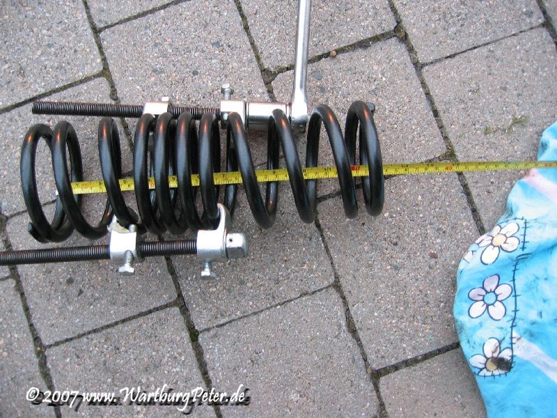 Die Vorderfedern müssen auf mindestens 32cm, besser 31cm zusammengepreßt werden, sonst bekommt man sie nicht montiert! Stehen nur handelsübliche externe Federspanner zur Verfügung, ist dies ein mühsames Geduldsspiel, denn man muß sich zum Ansetzen für die richtigen Windungen entscheiden, sonst bekommt man den Spanner nicht abgebaut. Auf den folgenden Bilder kann man etwa sehen, welche Federlagen man bespannen muß, um auch das Werkzeug nach dem Entspannen "wieder los zu werden".