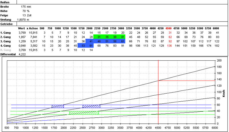Für alle, die sich mit Kennlinien und Anschlußplänen nicht auskennen: je weiter rechts oben im markierten Feld die Motorkurve sich befindet, um so kraftvoller ist der Motor. Die Geschwindigkeitsbereiche sind nur exemplarisch zum Vergleich der beiden Getriebe eingetragen. Selbstverständlich kann man z.B. im 3. Gang weniger als 40 oder mehr als 70 km/ h fahren!