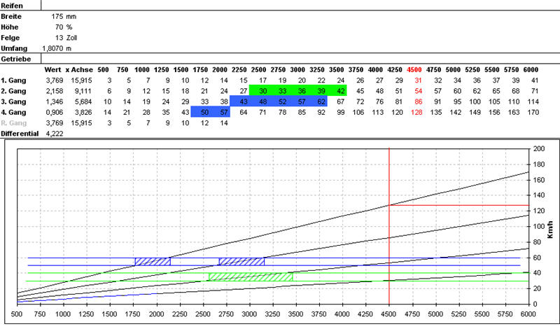 Test- und Simulationsmöglichkeiten stehen mir leider auch nicht zur Verfügung. Also erst einmal die Leistungsdiagramme des Wartburgs studiert. Die finden sich in jeder Betriebsanleitung. Dazu die Übersetzungen der einzelnen Getriebegänge in eine Tabelle geschrieben und die Geschwindigkeiten errechnet. Ein Unsicherheitsfaktor bleibt: Ungenauigkeiten, Verluste sind schwer zu berücksichtigen. Dennoch stelle ich fest, daß meine Tabelle, die selbstverständlich auch die Reifengröße berücksichtigt, beinahe deckungsgleich mit den AWE Angaben sind. Andere Tabellen, die ich sah, beschönigten hier manches. So bleibe ich voller Überzeugung bei meiner Tabelle und fange an, mit Werten zu spielen, um mir anzusehen, wie sich die Kurven verändern.