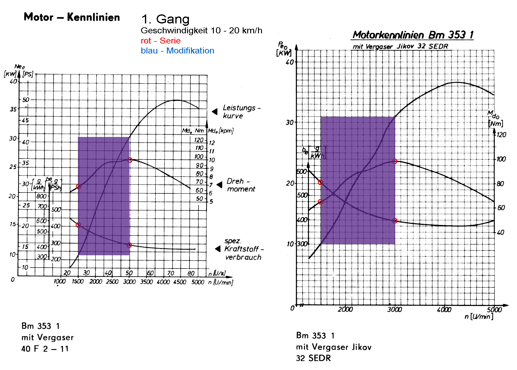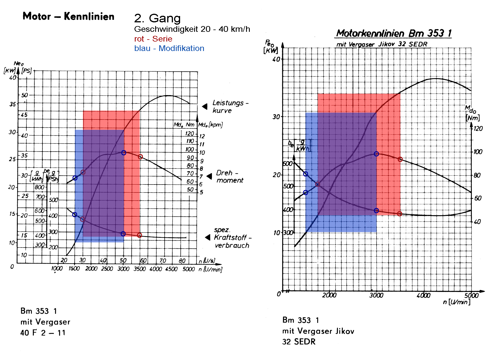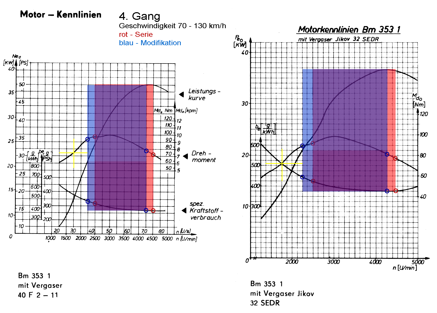 Was sieht man dort? Zunächst einmal die Leistungskurven des Standard-Motors (50PS) einmal mit BVF-40 Vergaser (links) und einmal mit JIKOV 32SEDR (rechts).