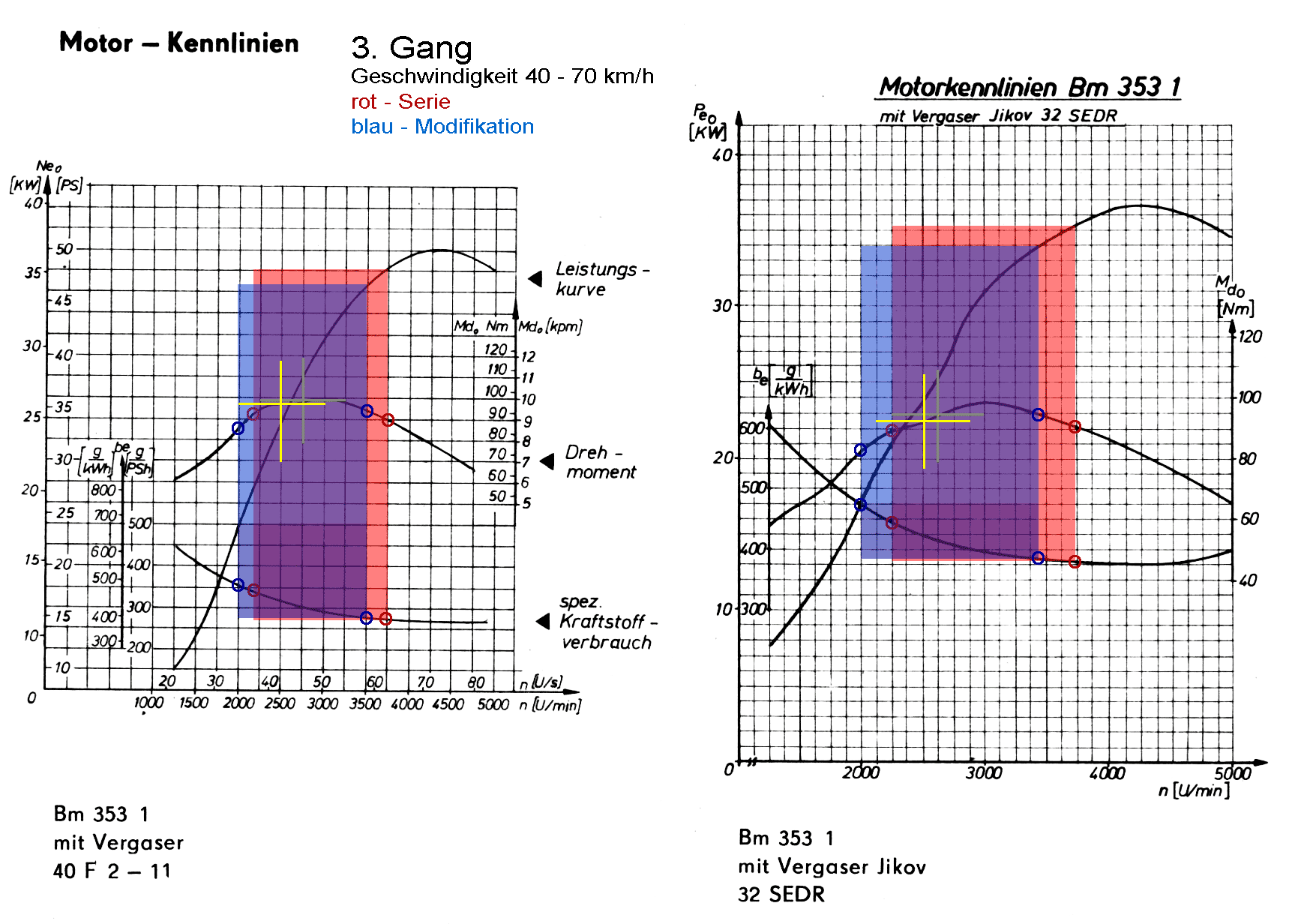 Sicher, die Getriebemodifikation ist gering ("rot-blau-Verschiebung"). Aber wie schon Eingangs gesagt, Ziel war kein Rennwagen, sondern die Beendigung von Kompromissen aus DDR-Tagen. Man könnte sich vorstellen, wenn man nur wenige PS mehr hätte, sich der "verschobene Bereich "kompensieren würde...