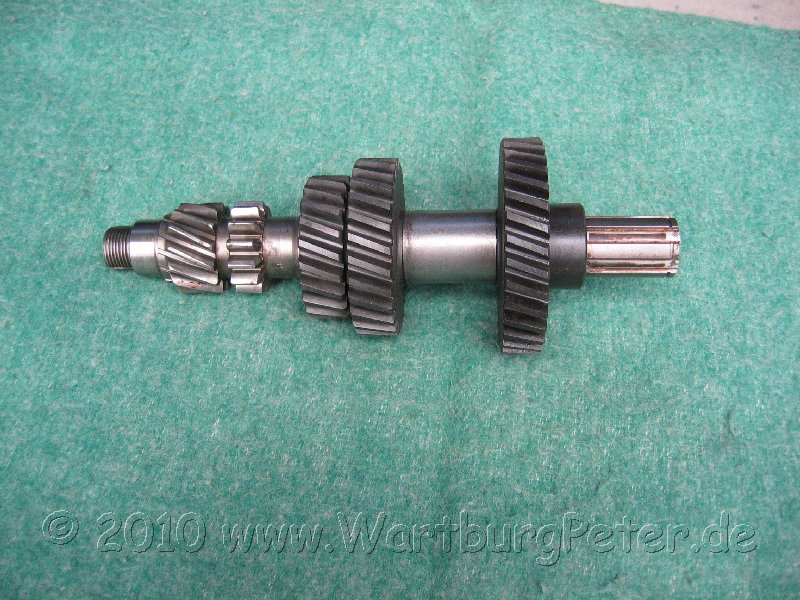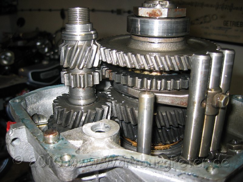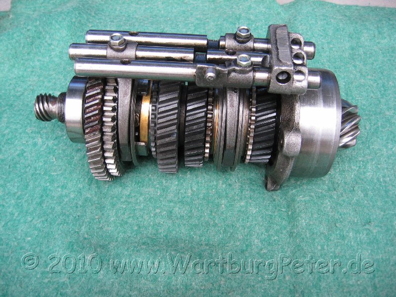 Bild rechts, die fertig montierte Abtriebswelle, das Teil, bei dem die Gänge geschaltet werden.