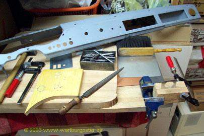Also habe ich alles demontiert, begradiert und zurecht gehämmert. Alle meine Vorstellungen ausgemessen und aufgezeichnet. Hierbei ist es ratsam, alle Anbauteile zum Vergleich und für die Abstände parat zu halten. Hin und wieder habe ich auch an meinem noch eingebauten Armaturenbrett verglichen. |
