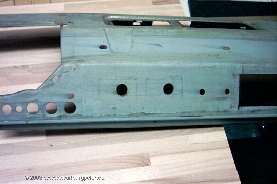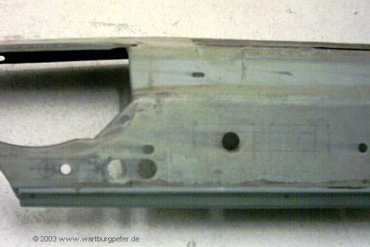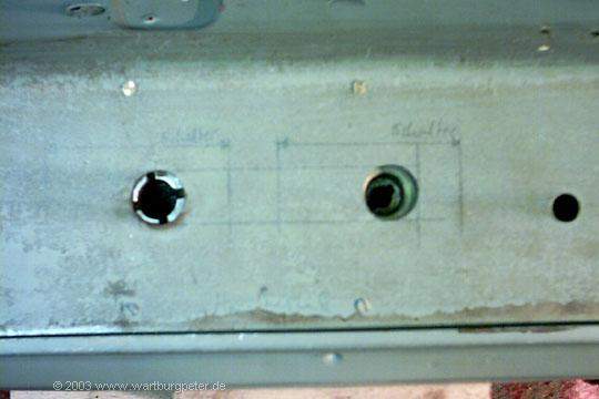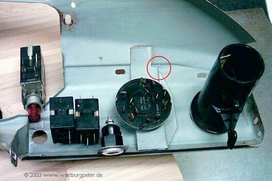 | Nebenbei bemerkt: Beim Hantieren mit dem nackten Blech des Armaturenbrettes, bemerkte ich ein quietschen. Das hätte man im eingebauten Zustand nie gefunden und der Wartburg neigt eh zu allerlei Geräuschen. Dort wo der Kreis eingezeichnet ist (unten), traf die Spitze der Halterung auf das Grundblech, völlig ungeschützt. Quietsch-quietsch! |