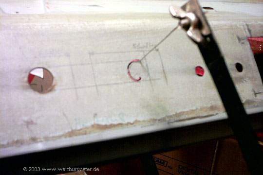 Da durch Sägen und Feilen meistens der Ausschnitt größer als gewollt wird, wählt man beim Anzeichnen von vornherein einen kleineren Radius und zeichnet sich die äußersten Grenzen auf das Blech, dann kann nichts schief gehen und der Schalter sitzt später perfekt. Wenn alle erforderlichen Löcher gesetzt sind, werden die nicht benötigten Löcher wieder verschlossen. |
