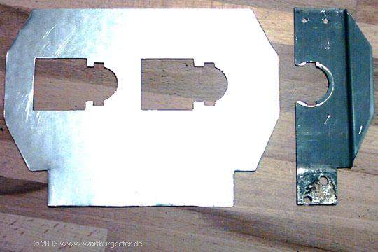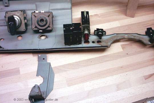 Das Abwinkeln verleiht dem Blech Steifigkeit. Man muß nur darauf achten, das der Abstand zum Armaturenbrett so groß gewählt wird, daß die Befestigungsmutter des Wisch-Wasch-Schalters sich leicht drehen läßt. Die großen Ausschnitte sind erforderlich, um die Schalter leichter ein- und ausbauen zu können. Kaum erwähnenswert: Alle Bleche sollten entgratet werden, damit man später im eingebauten Zustand sich nicht daran verletzen kann. |