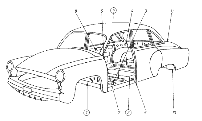| 7 | A | vordere Säulen unten links u. rechts | Öffnungen für Scharnierbänder unten, Spritzrichtung nach innen zwecks Konservierung der unteren Säulenecken | unten, oben bis Gürtellinie | - |