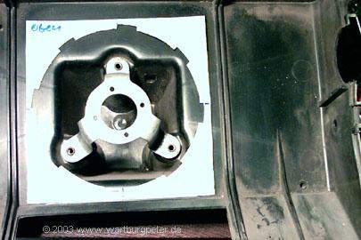 Zunächst heißt es wieder Maß nehmen, vergleichen, Einbaulage ermitteln. Am besten per Schablone! Ich habe mich entschlossen, das Gehäuse so umzubauen, daß man den Golflüfter wie im Golf mit einer kleinen Handbewegung ein- und ausschrauben kann. Dazu muß ich eine Öffnung mit etlichen Haltenasen aus dem Verteilergehäuse herausarbeiten. |