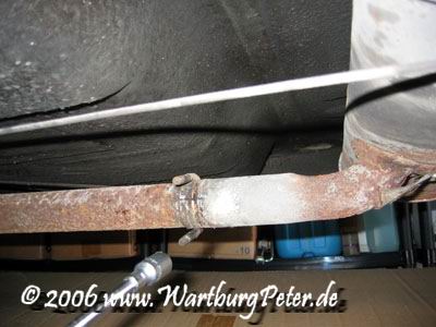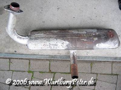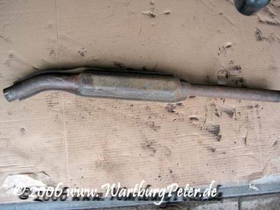 Die Auspuffanlage lies sich mühelos abschrauben und zerlegen. Schraubverbindungen hatte ich immer schön gefettet!! Zum Glück fahre ich Wartburg und ich mußte das Fahrzeug weder aufbocken, noch sonst welchen Zirkus veranstalten. Eine Decke auf den Boden und binnen weniger Minuten lag die Auspuffanlage auf dem Boden und lies sich leicht auseinanderziehen! Der Walker Endschalldämpfer vom Opel, den ich etwa zeitgleich dort eingebaut hatte, den habe ich übrigens bereits letztes Jahr austauschen müssen, weil er ein faustgroßes Loch hatte! |