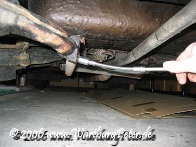 Aufgrund seiner "falschen" Abmessungen, schleift das Handbremsseil bereits im "normalen" Zustand. Ich werde auch das Handbremsseil wechseln müssen, da es inzwischen angerieben und angerostet ist. Sicherheit geht vor. Bei meinem Wartburg Camping habe ich das Problem bereits gelöst, indem ich die Hülsen für die Seilhalterung am Rahmen etwas tiefer setzen ließ. |