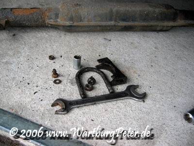 Wenige Minuten später: die Auspuffanlage liegt auf dem Boden. |