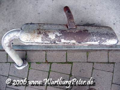 Der Hauptschalldämpfer aus DDR-Produktion zeigt Durchrostungen, die geschweißt werden mußten. Den Schalldämpfer habe ich mit seinem Originallack betrieben! Kein Wunder also, daß er rostet! |