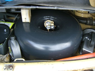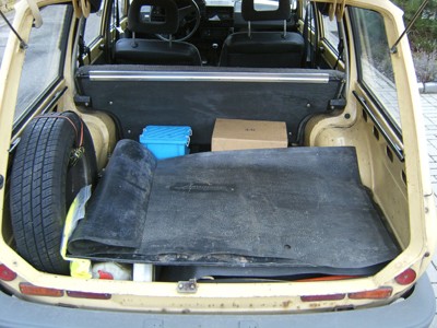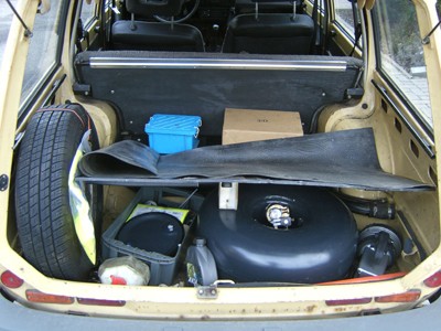 Wer auf das Reserverad nicht verzichten mag, kann es nach Kürzung der Stauklappe hochkant transportieren. Ein wenig Platz bleibt neben dem Gastank noch für Werkzeug und Zubehör.