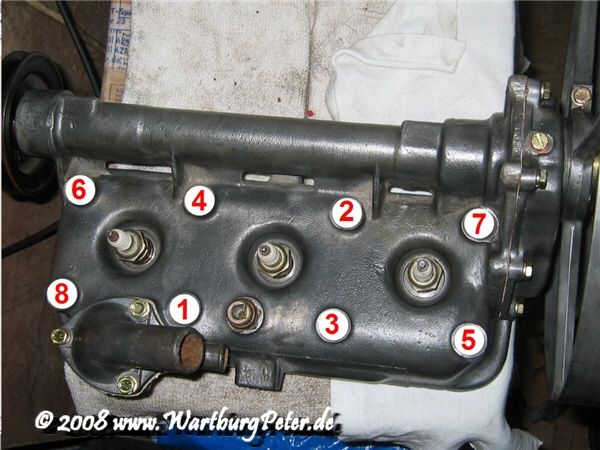 5. Bei kaltem Motor werden die Muttern nun mit starrem Schlüssel in vorgeschriebener Reihenfolge um einen Winkel von 30° - 35° nachgezogen.