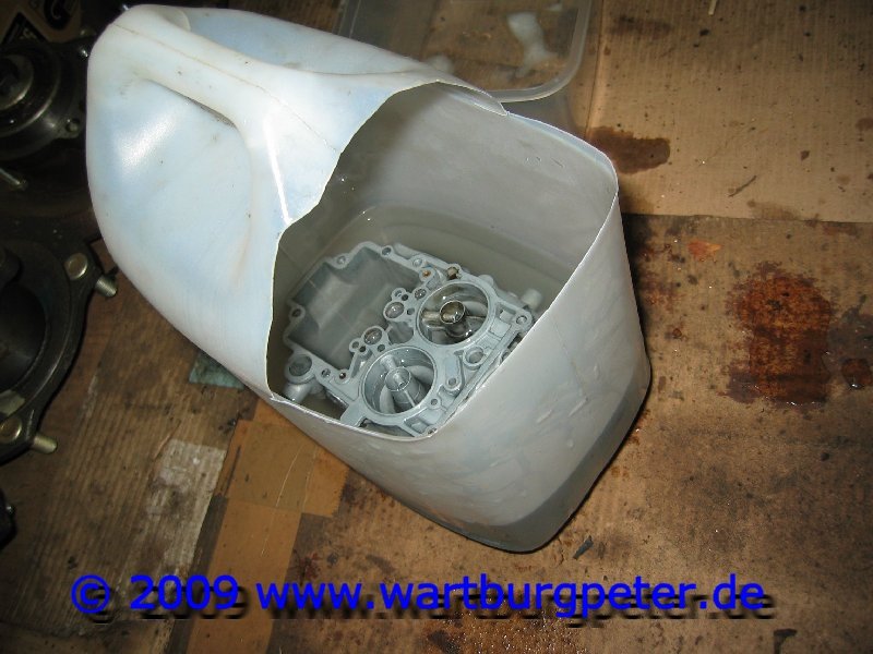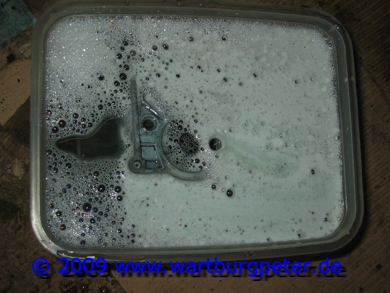 Ah, heftig! Es schäumt gleich drauf los. Also kurz einwirken lassen und dann verdünnen, schließlich soll sich der Vergaser nicht auflösen und auch die Kanäle sollen nicht doppelt groß ausgeätzt werden.